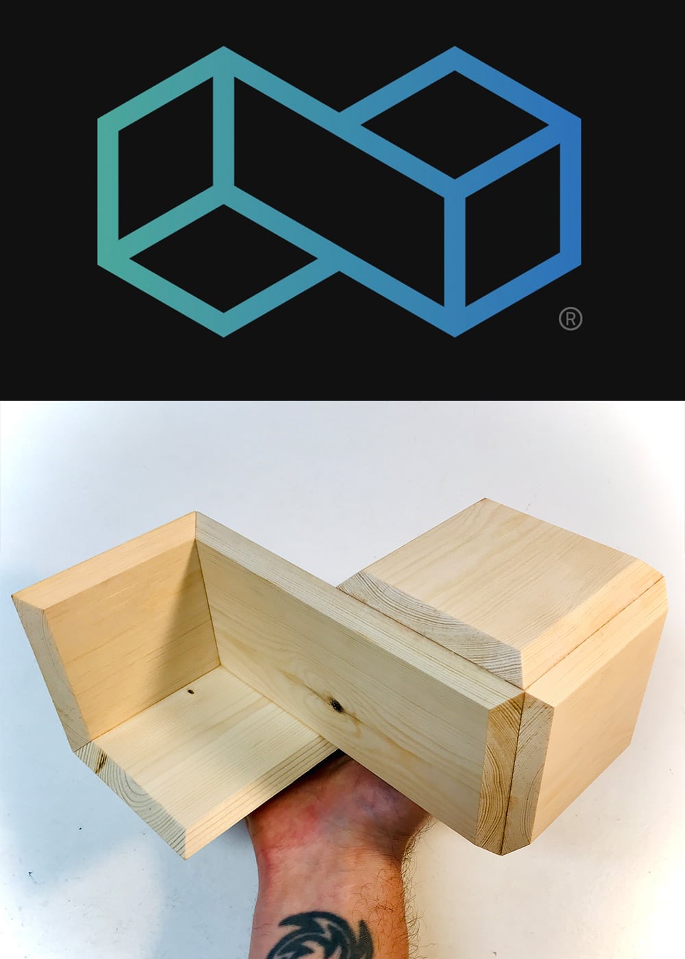In the example shown here, I worked with a client to create a sculpture inspired by their company logo. Using the reference image of the logo, I created a 3D prototype. I then reproduced the form and expanded it into a tessellation pattern of multiple logos. The client chose to use ash and elm in their sculpture and to include my Futuretro interactive lighting and smart control system.